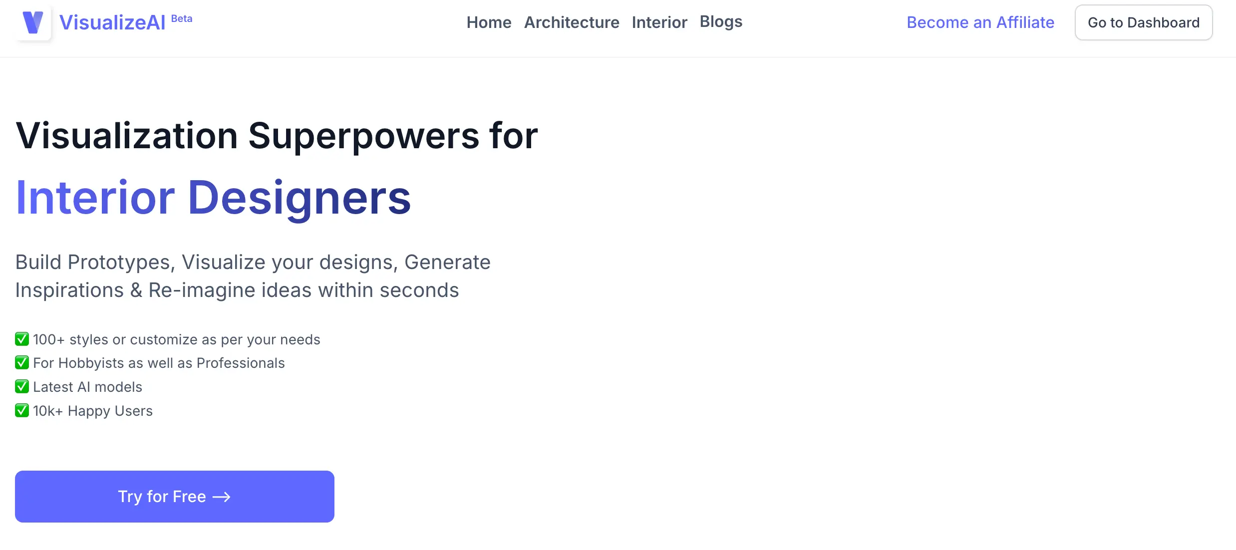 VisualizeAI is designed with interior decorators, designers and architects in mind. Unlike many tools that only focus on interiors, VisualizeAI can also redesign and render exteriors—a capability that’s less common in the AI interior design tool market. I will be testing out this tool’s interior and exterior redesign capabilities.
