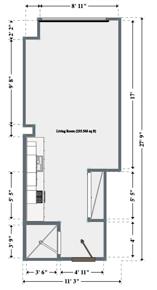The design intent here was to create a functional space that includes a place to sleep, a sofa, TV viewing, and one table that can be used for both dining and working. The current floor plan isn’t making the most of the space—it feels awkward and inefficient.