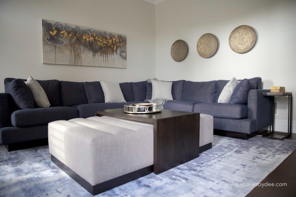 Spaces by Dee transformed this previously dated family room into a stylish space that the clients can be proud and excited to entertain in. A new floor, pot lighting and a new media wall were needed to bring this space into the new millennium. Navy blue and gold accents were intentionally brought into the space to create an inviting, warm and current aesthetic.