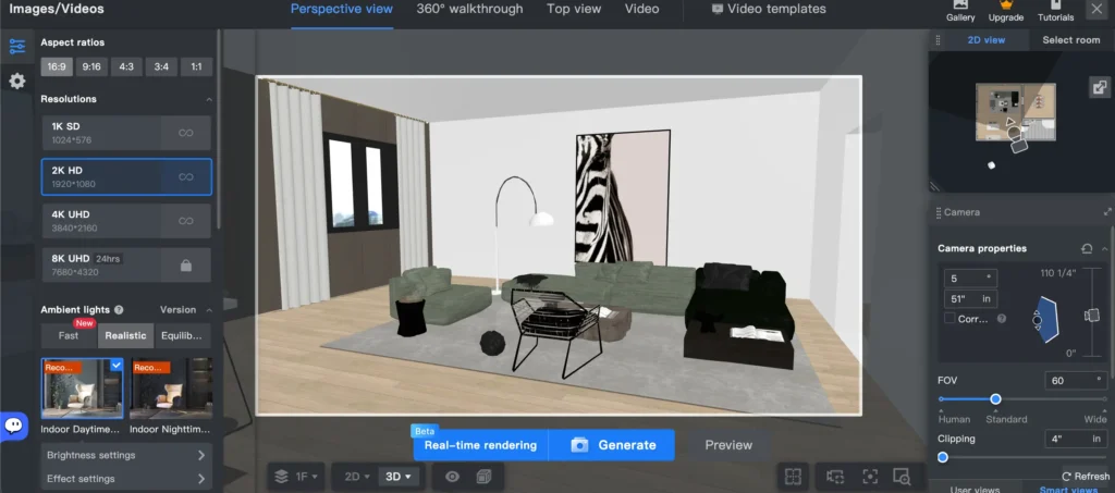 Coohom also has a few AI capabilities. Such as, re-styling your space that you have built to different styles, they also have an AI ceiling template which applies lighting to a space and an image generator which I have tested here.